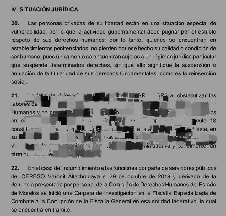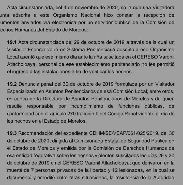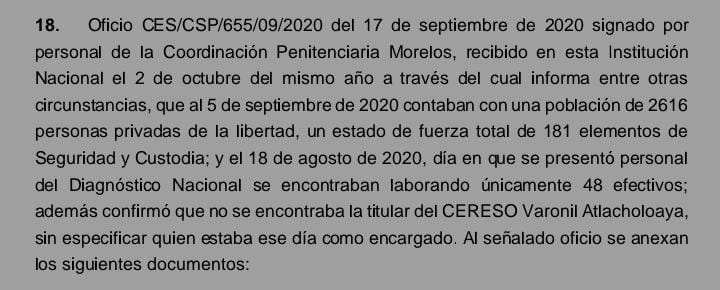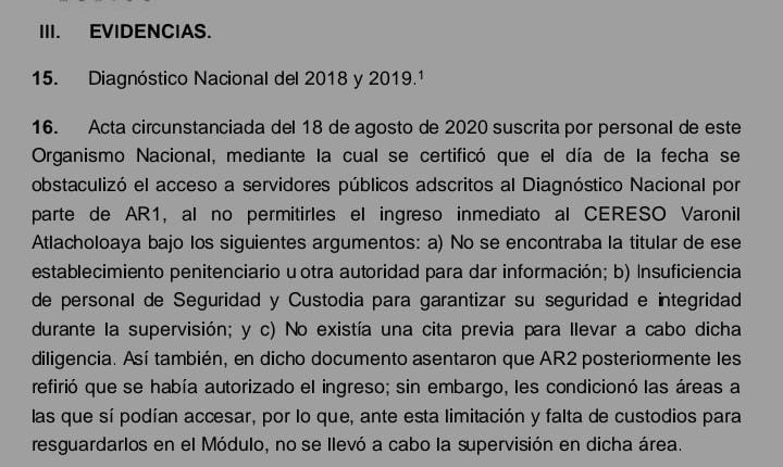Cabe precisar que el 18 de agosto de 2020, personal del Diagnóstico Nacional, se encontraba acompañado de un servidor público de la Comisión de Derechos Humanos del Estado de Morelos, por lo que tuvieron conocimiento que también personal del CERESO Varonil Atlacholoaya ha obstaculizado en otras ocasiones su labor.